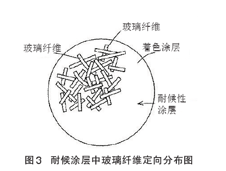 該高耐候性彩色水泥瓦制作流程是將以水泥為主要成分的坯料擠壓成坯,瓦體養(yǎng)護(hù)硬化,涂以涂料,修平整,形成底層涂膜層。為了防止瓦中堿分對上層涂膜層的侵蝕,可在底涂膜層上,涂以耐堿性涂料,形成耐堿涂膜層,然后涂以著色涂料,形成裝飾涂膜層,最后涂以耐候涂料,形成耐候涂膜層(見圖1和圖2)。著色涂層由含有所需著色顏料的水性丙烯酸涂料構(gòu)成,其厚度約為100μm。耐候性涂層由與著色層相同的水性丙烯酸涂料與耐候性纖維(添加量為7%~12%)組成的涂料構(gòu)成,其厚度約為 25μm。耐候性涂料用噴槍高壓噴涂在瓦著色裝飾涂層上。耐候性涂料涂覆在著色涂層上時(shí),玻璃纖維以平躺姿態(tài),水平方向無序隨機(jī)定向分布(見圖 3)。對瓦涂以耐候性涂料后,為了固定玻璃纖維,約在100℃下充分干燥。